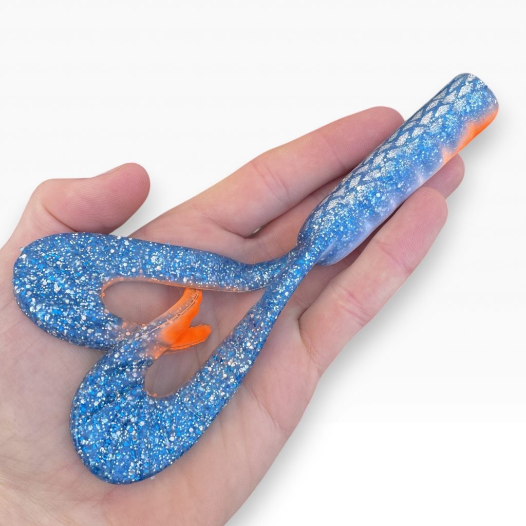 Après plusieurs prototypes et optimisations, le résultat est un double grub de 15 cm avec un gros corps et deux queues en grub, parfait pour créer des vibrations importantes sous l’eau à basse récupération.
