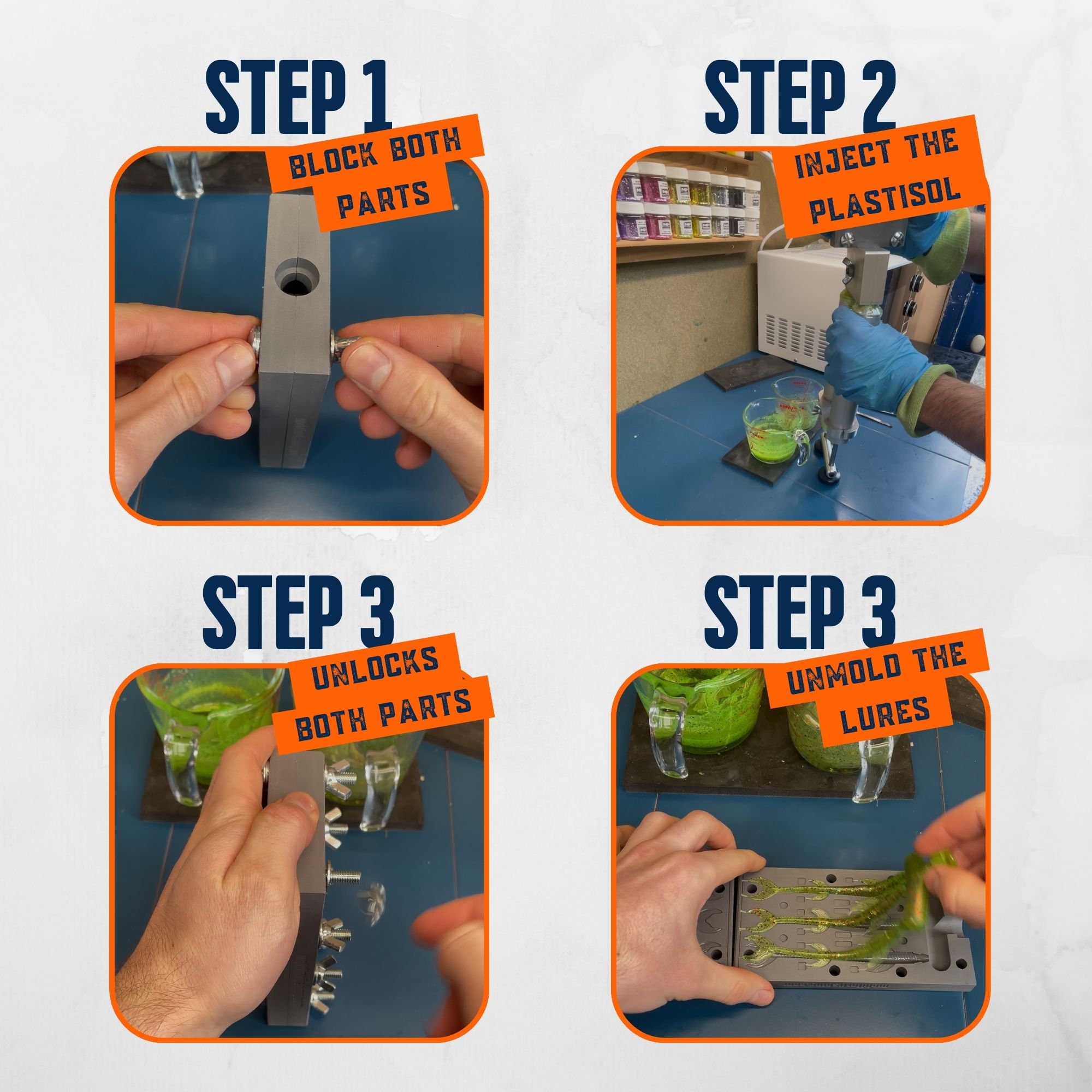 Ces moules pour fabriquer des leurres souples de pêche sont conçus pour la fabrication artisanale et offrent un excellent compromis entre qualité, durabilité et prix. Disponibles en version rigide, ils permettent de produire des leurres souples précis, réguliers et performants.