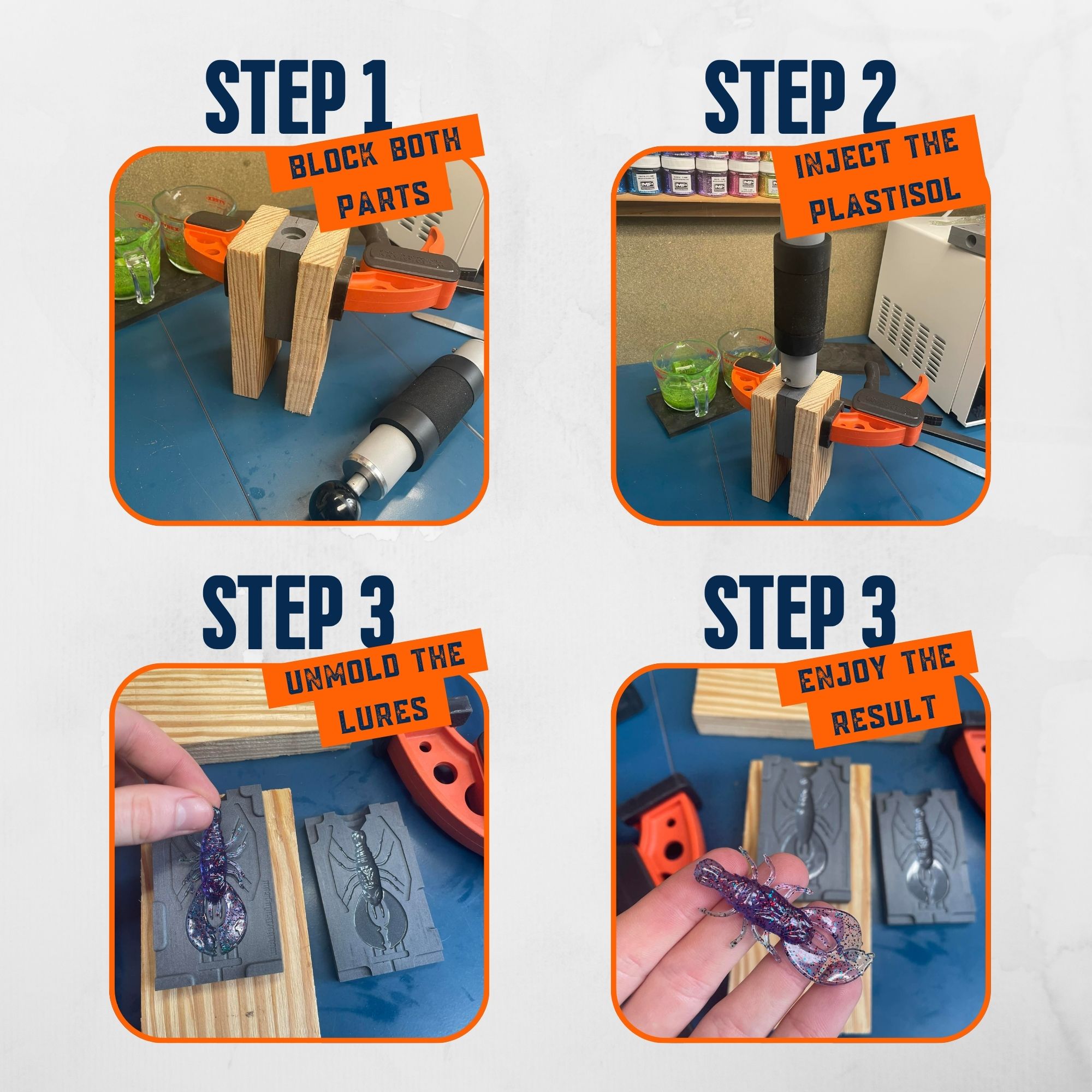 Moule pour la fabrication artisanale de leurres souples, compatible plastisol haute température (200 °C+). Conçu pour une utilisation avec injecteur obligatoire, il offre une finition brillante et une excellente durabilité. Alternative économique aux moules aluminium, idéale pour débutants comme passionnés.